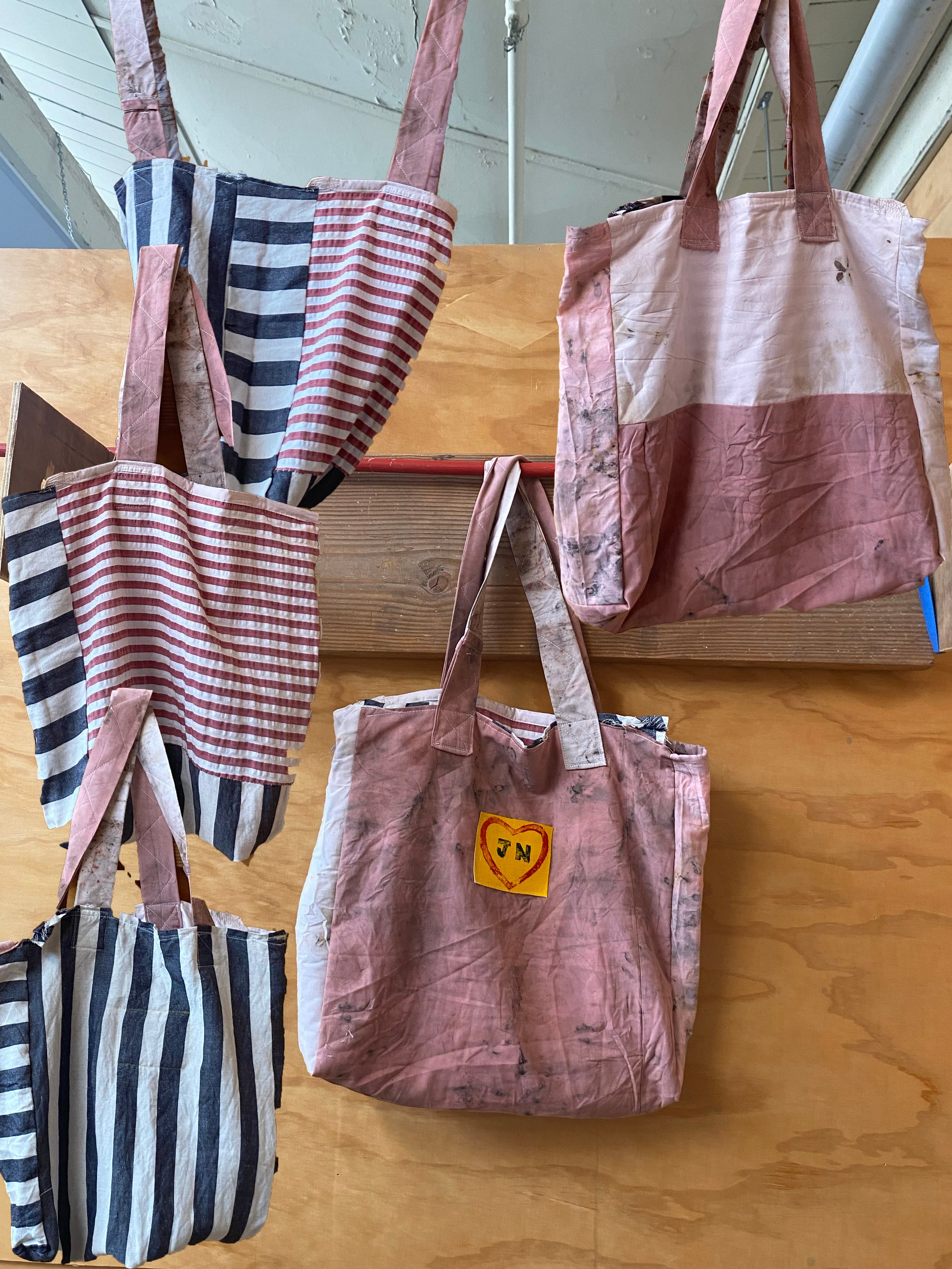 Made from collected striped cottons and bed sheets (which have been through a steam dying process with with eucalyptus, other garden shrubbery and rusted fencing wire.